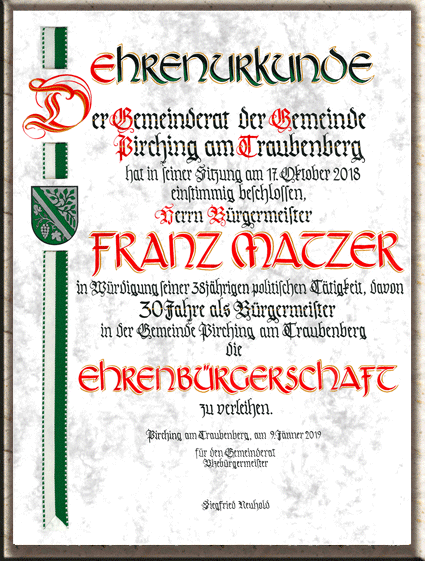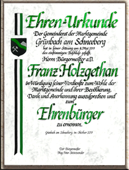 handgeschriebene Urkunde für Verleihung des Ehrenbürgerrechtes