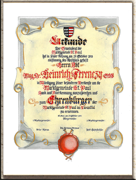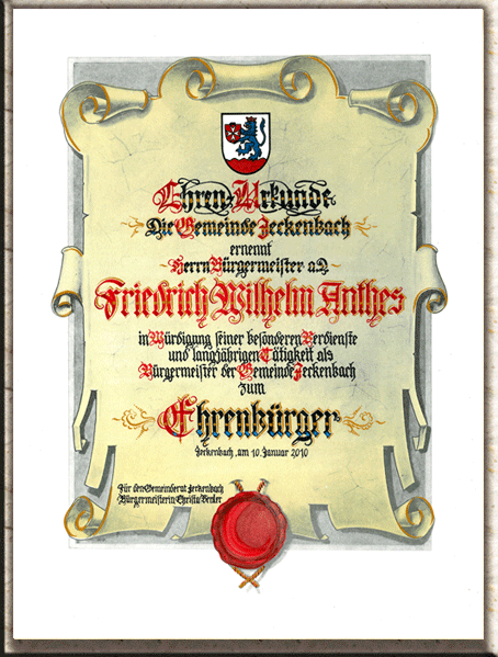 handgefertigte Ehrenbürgerurkunde inkl. Wappen; Farben für Text frei wählbar!