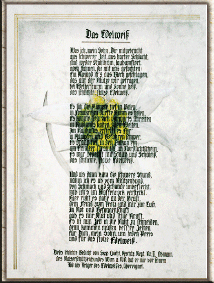 Gedicht, handgeschrieben mit Schattierung und handgemaltem Edelweiß im Hintergrund. Material: hochwertiger Urkundenkarton 200gr in 3 Farbvarianten erhältlich. Größe: 30 x 40 cm