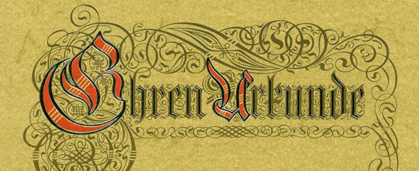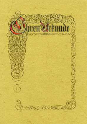 Ehrenurkunde gedruckt auf Pergamentpapier mit Ornament in Gold Wortlaut: Ehren-Urkunde in Gold geprägt