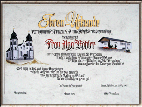 Handgefertigte Ehrenurkunde mit gemalten Aquarellen. Achtung, bei mehr Textzeilen und aufwändigeren Verzierungen erhöht sich der Preis!