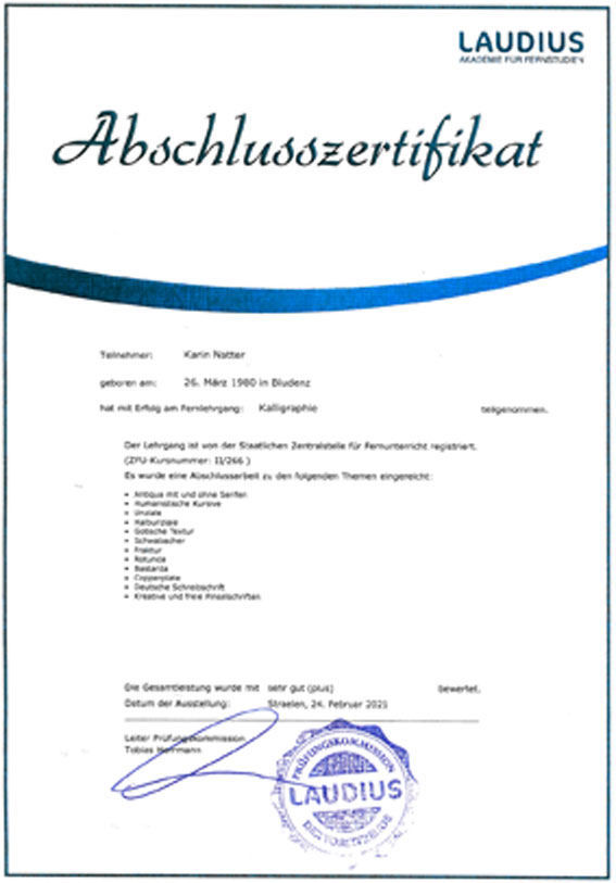 Zwischen 1995 und 2000 absolvierte ich die Ausbildung als Vergolderin, Schilderherstellerin und Malerin die ich erfolgreich mit 3 Lehrabschlüssen abschließen konnte. Nun habe ich noch das Zertifikat als gelernte Kalligraphin erworben. Dieses habe ich mit einem Sehr Gut+ abgeschlossen.
